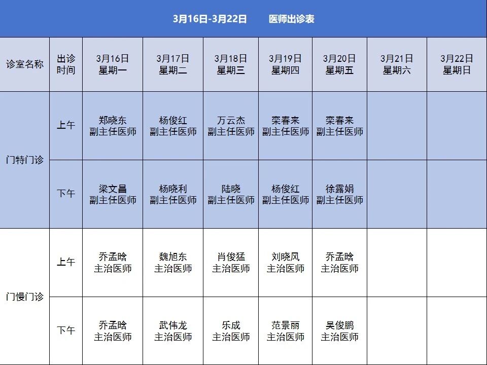 注:慢特病患者可至门诊服务台咨询相关事宜,出诊信息由门诊部提供,最终解释权归门诊部所有。