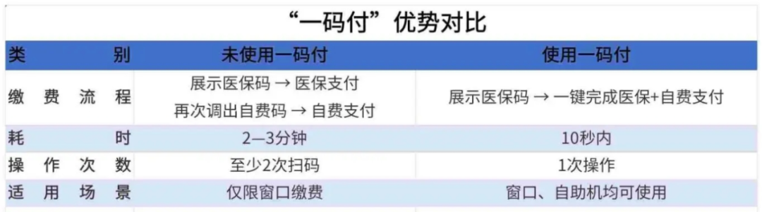 什么是一码付?“一码付”是一种基于医保电子凭证(医保码)的新型支付方式,就医结算时,只需展示一次医保码,即可实现医保结算(含统筹基金支付和个人账户支付)和自费部分“一步秒结”,其中自费部分优先从医保个人账户余额扣除,余额不足时自动跳转至第三方支付渠道支付。